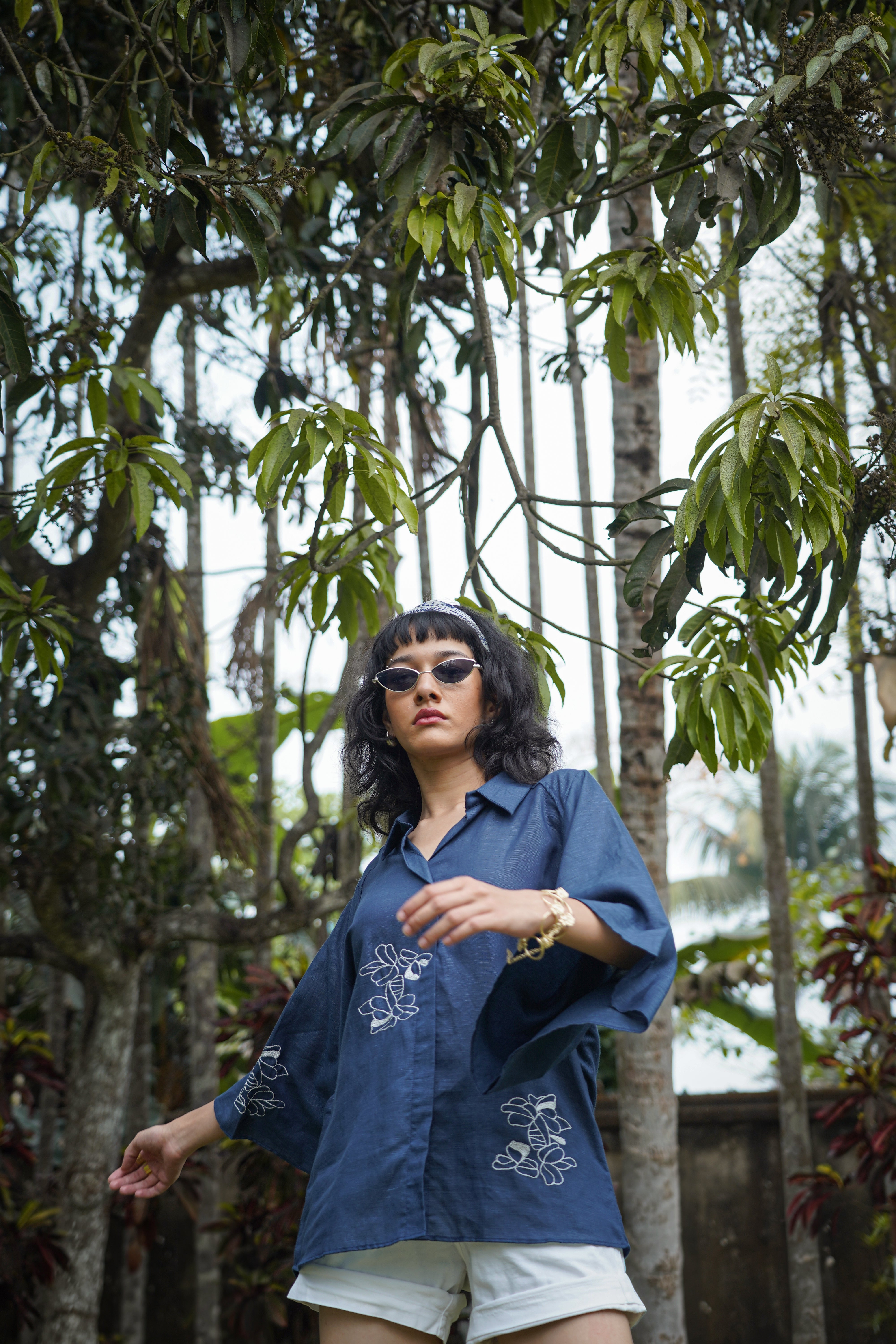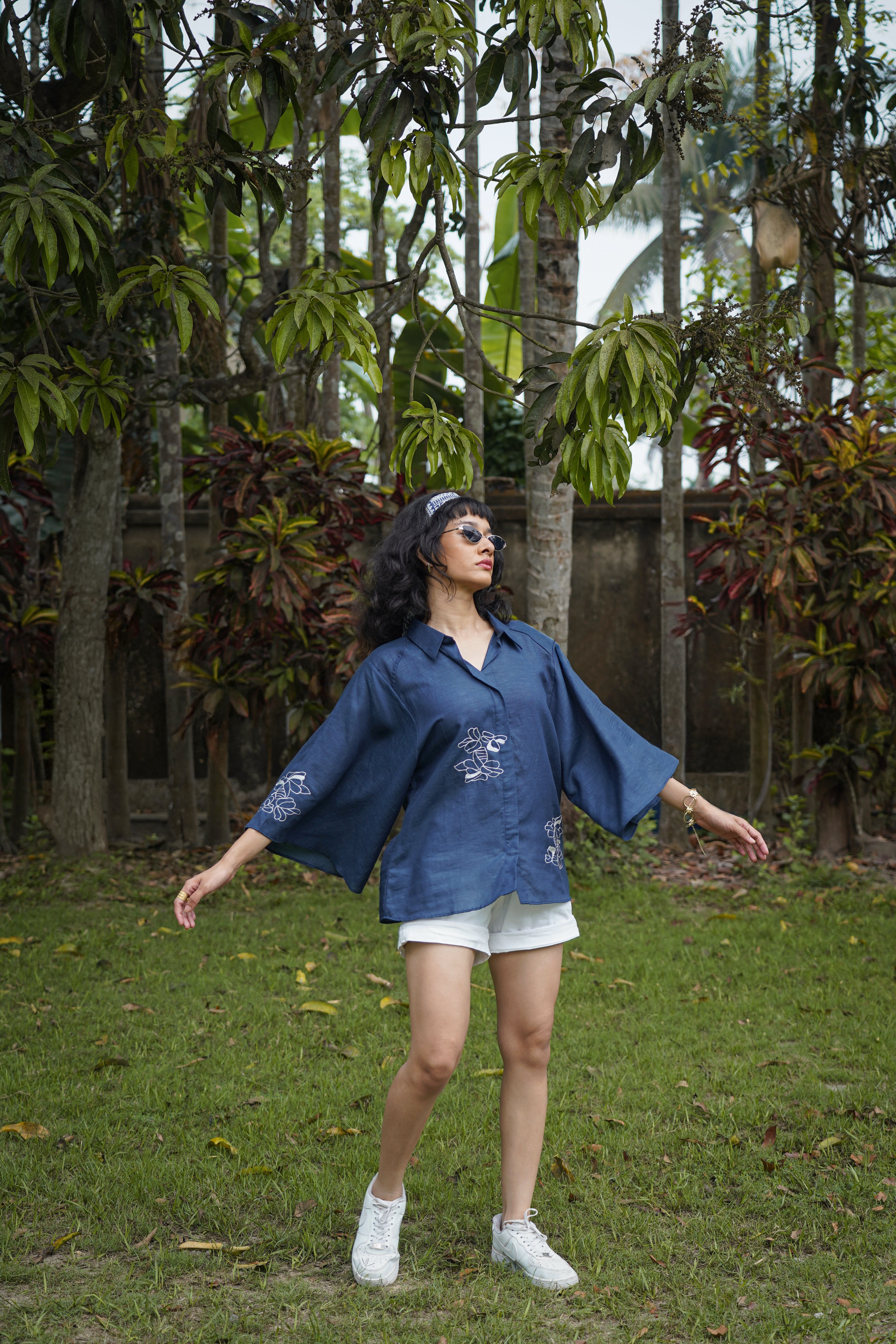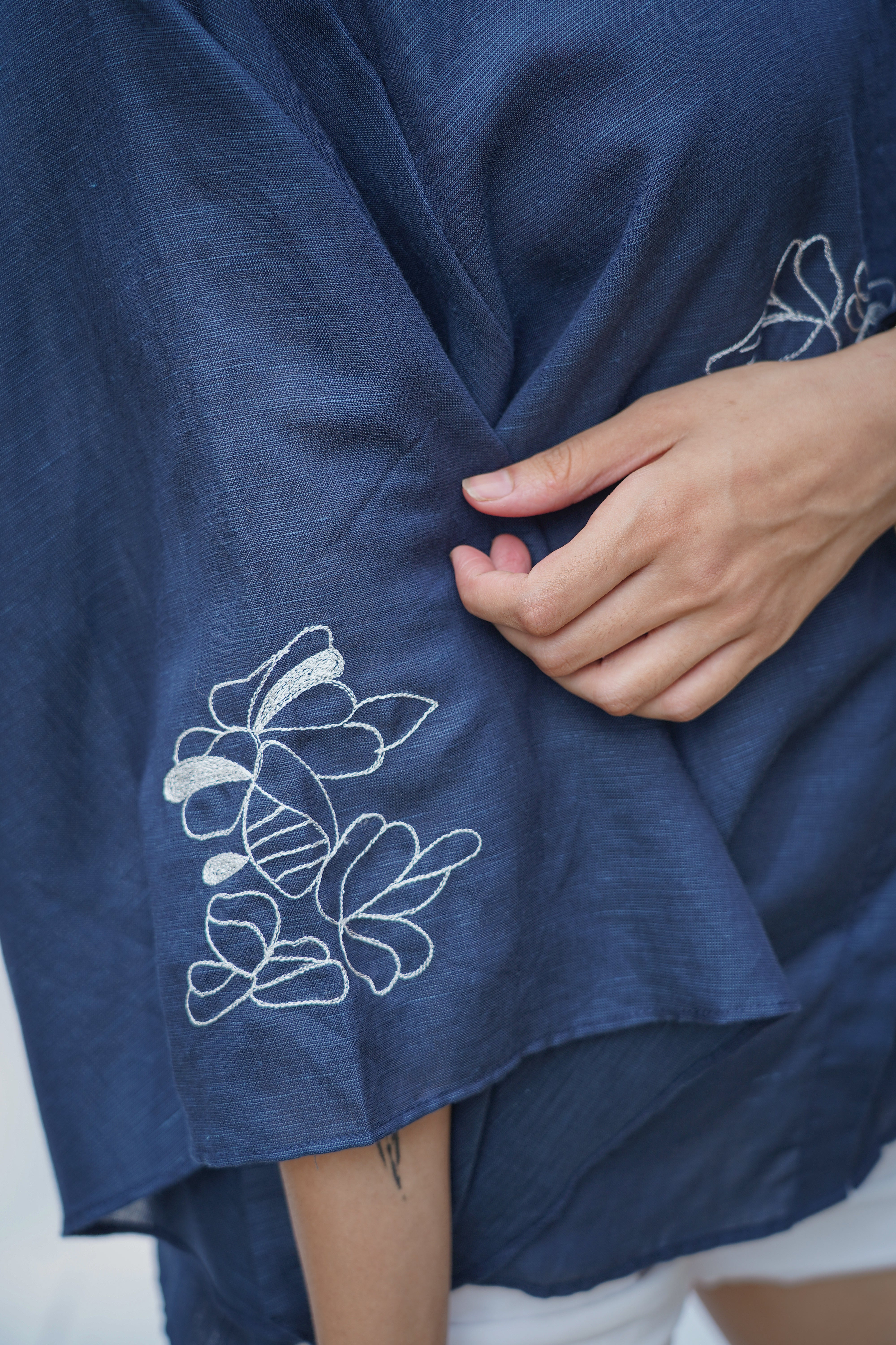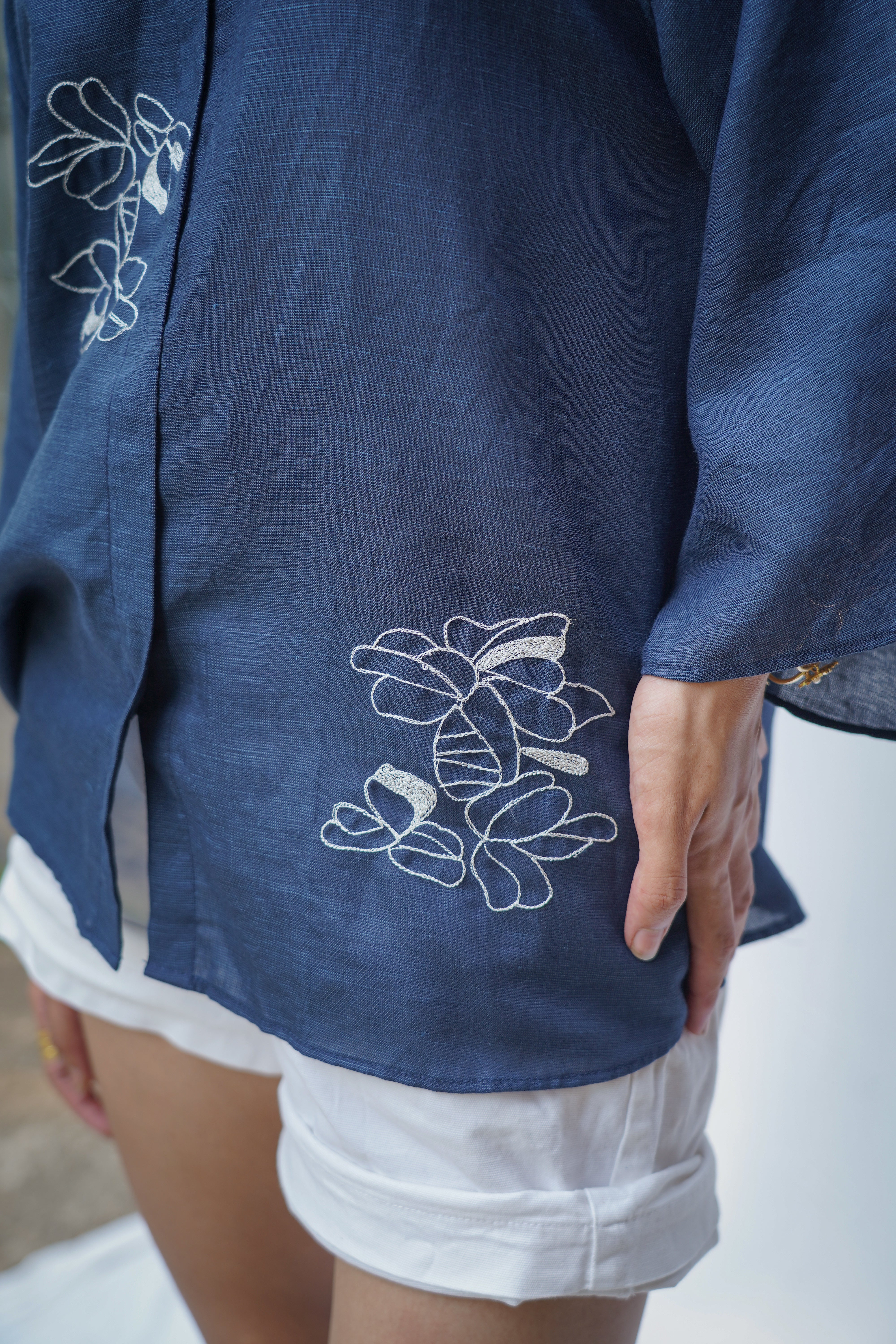 Drift Shirt features a relaxed anti-fit silhouette with dramatic cape-style flutter sleeves and delicate floral hand embroidery placed along the front and sleeve panels. Designed with a soft shirt collar and clean front placket, it blends structure with fluid movement, making it perfect for both elevated daywear and relaxed evenings. Crafted from our signature Hemp & Organic Cotton blend, the fabric is naturally antibacterial and odour resistant, UV resistant, and thermo-regulating, keeping you comfortable across all seasons. It softens with every wash and is mill-dyed for lasting colour fastness, ensuring rich indigo tones that stay beautiful over time. A graceful statement rooted in comfort and conscious design.