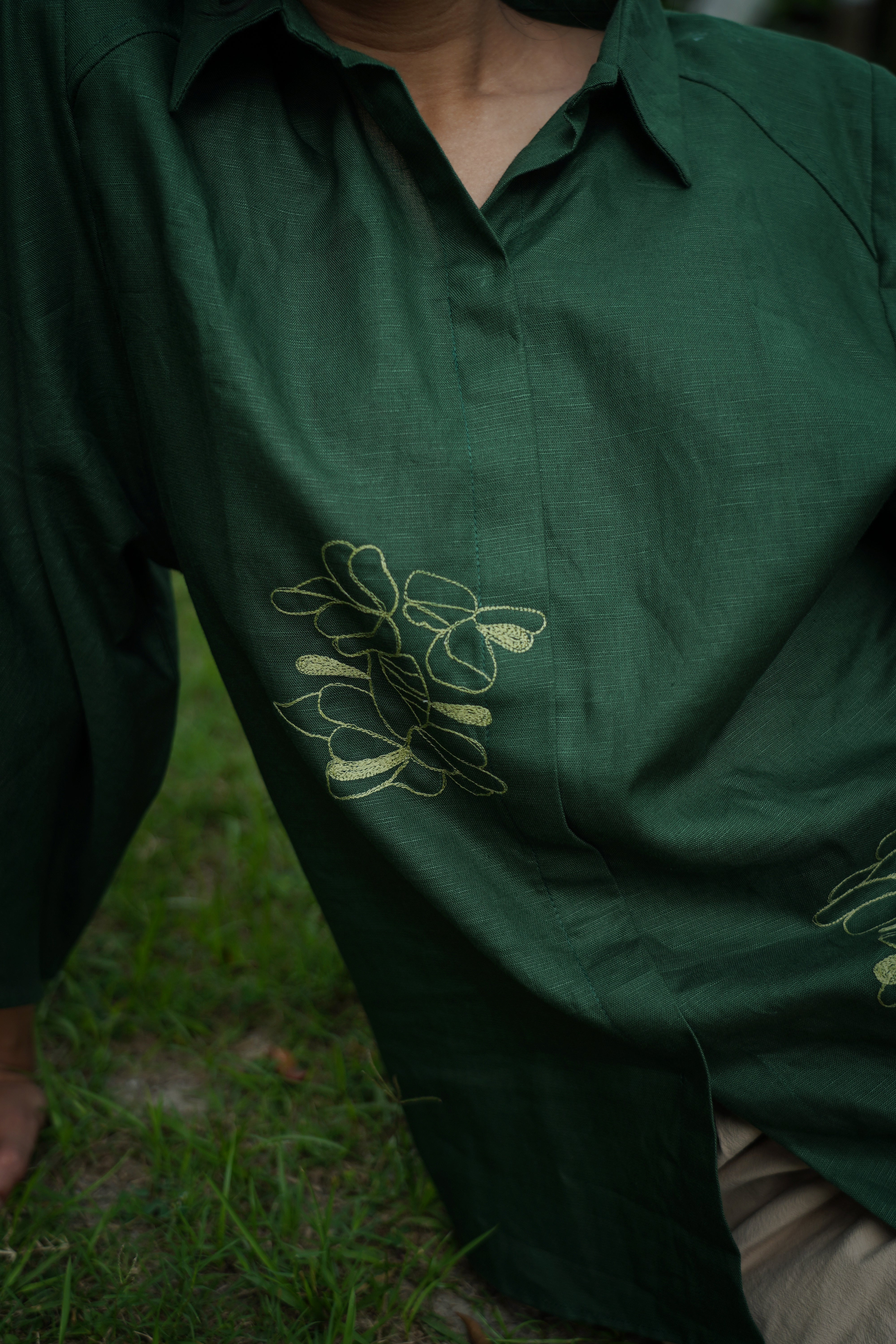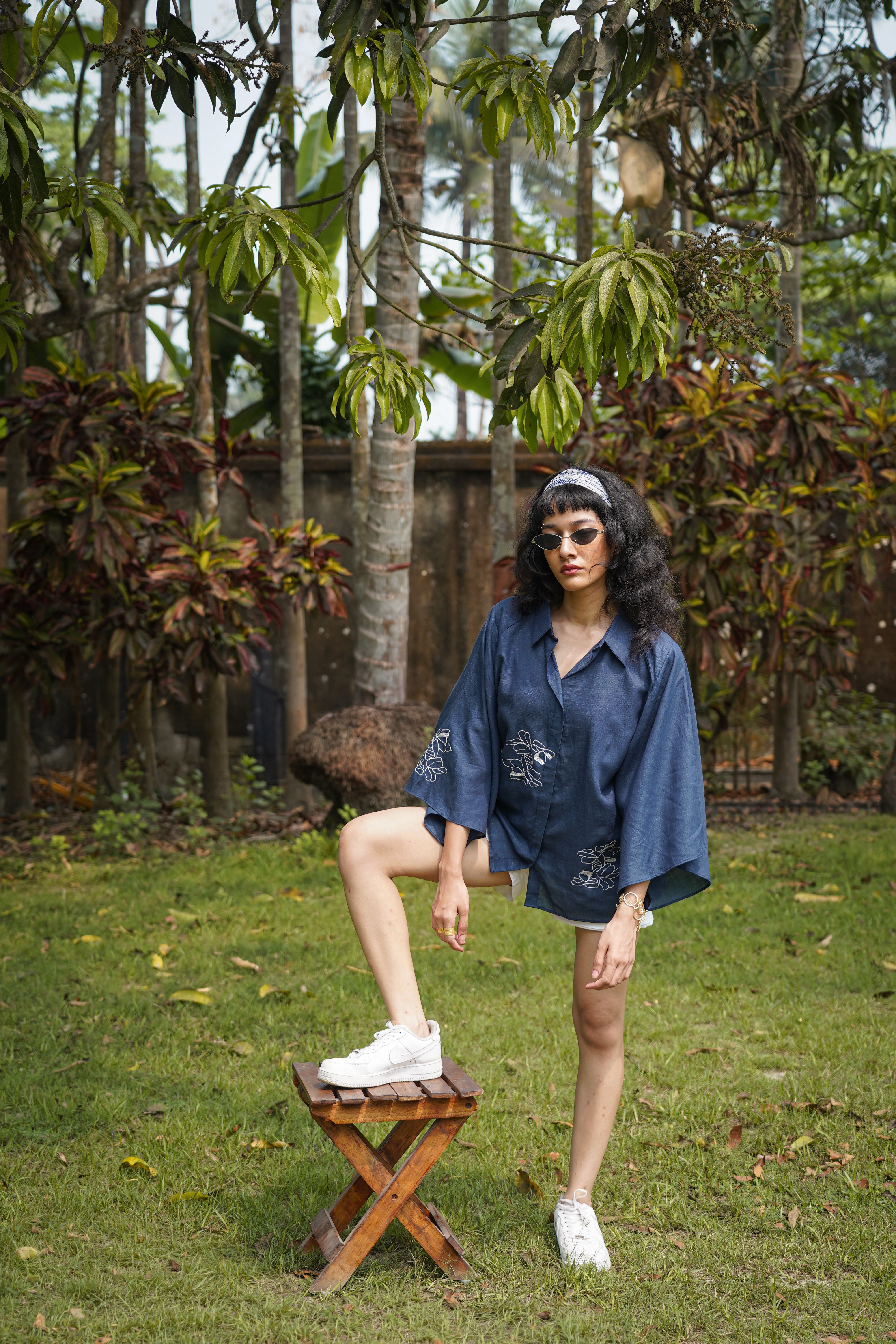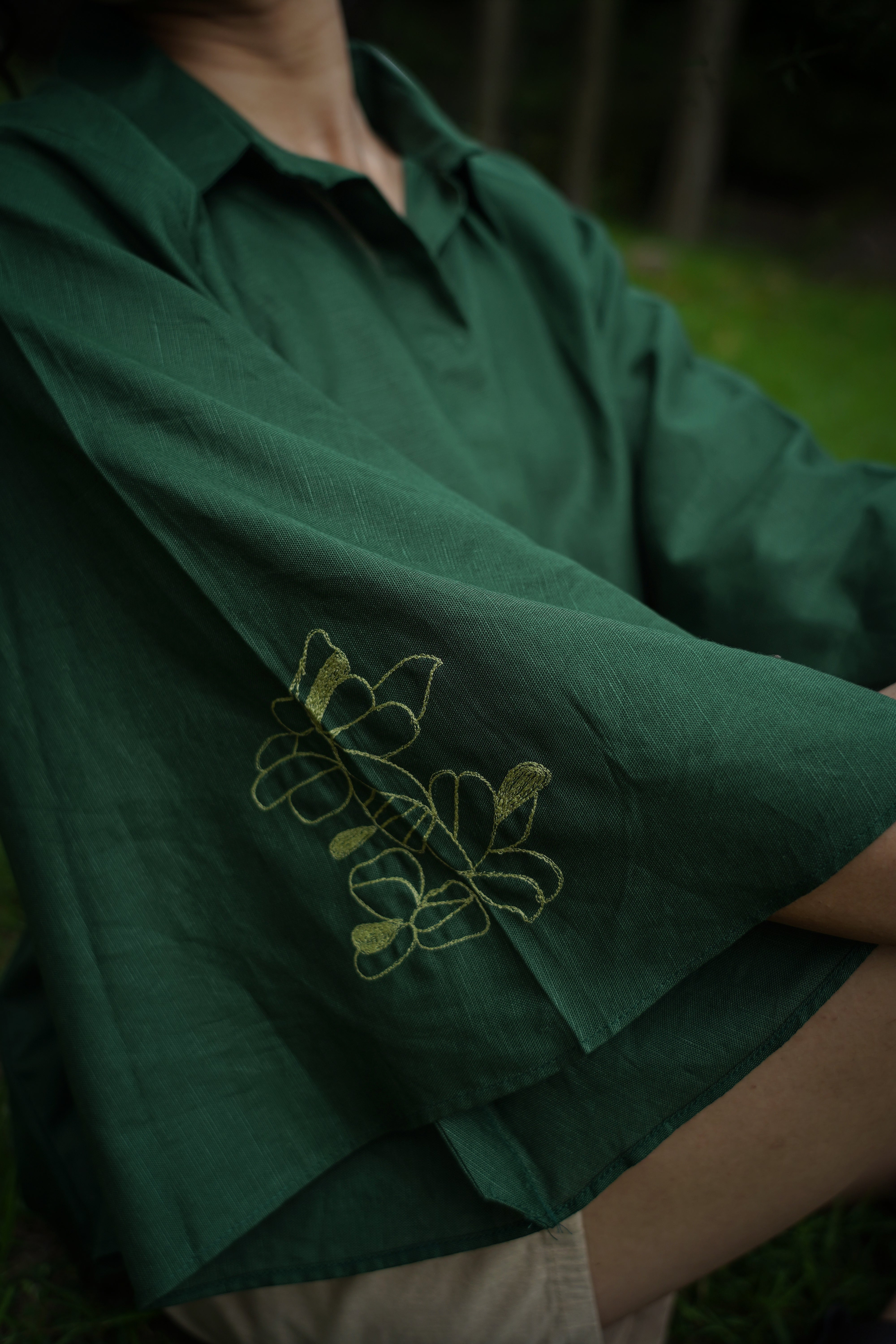 Drift Shirt features a relaxed anti-fit silhouette with dramatic cape-style flutter sleeves and delicate floral hand embroidery placed along the front and sleeve panels. Designed with a soft shirt collar and clean front placket, it blends structure with fluid movement, making it perfect for both elevated daywear and relaxed evenings. Crafted from our signature Hemp & Organic Cotton blend, the fabric is naturally antibacterial and odour resistant, UV resistant, and thermo-regulating, keeping you comfortable across all seasons. It softens with every wash and is mill-dyed for lasting colour fastness, ensuring rich indigo tones that stay beautiful over time. A graceful statement rooted in comfort and conscious design.