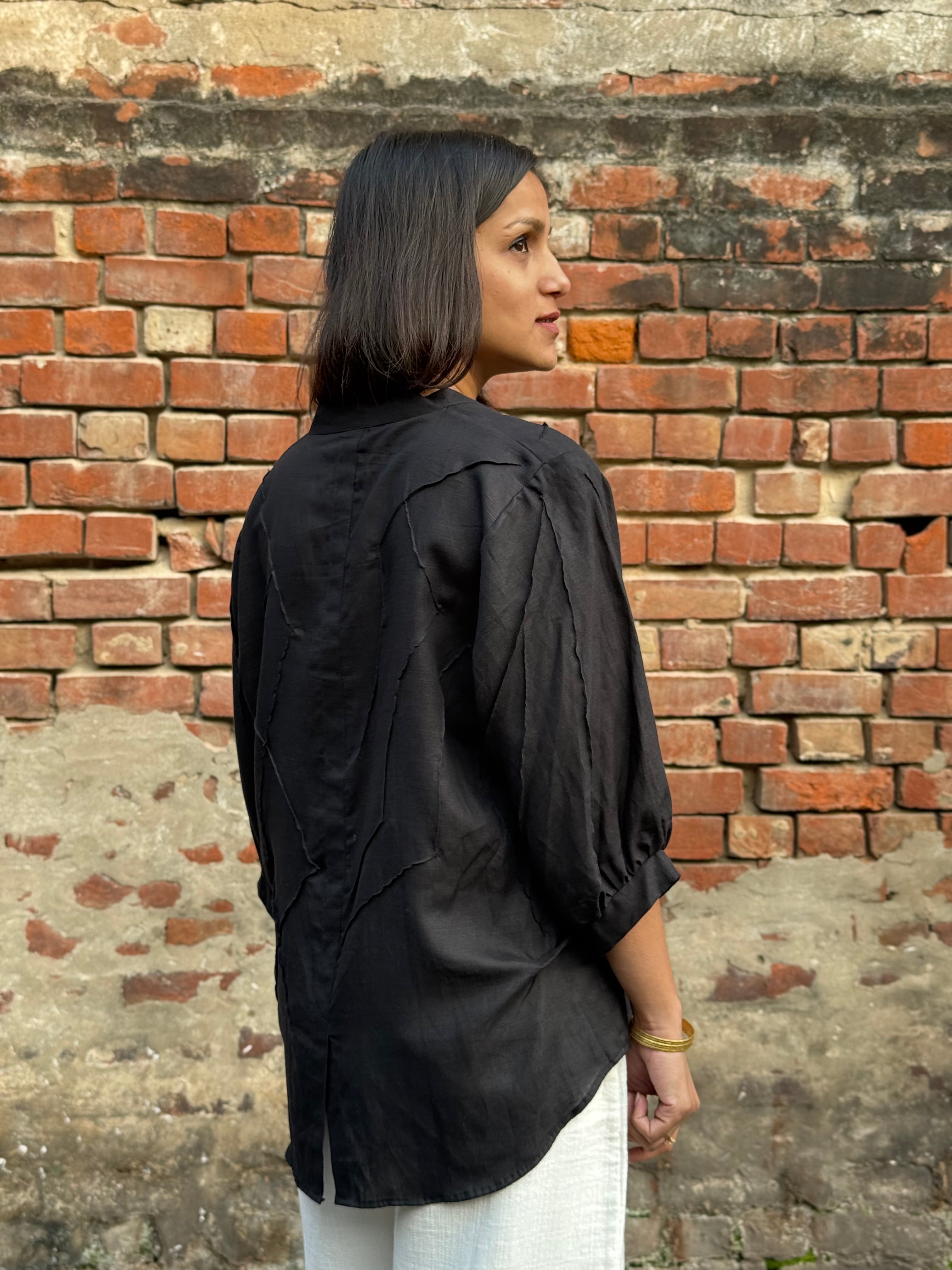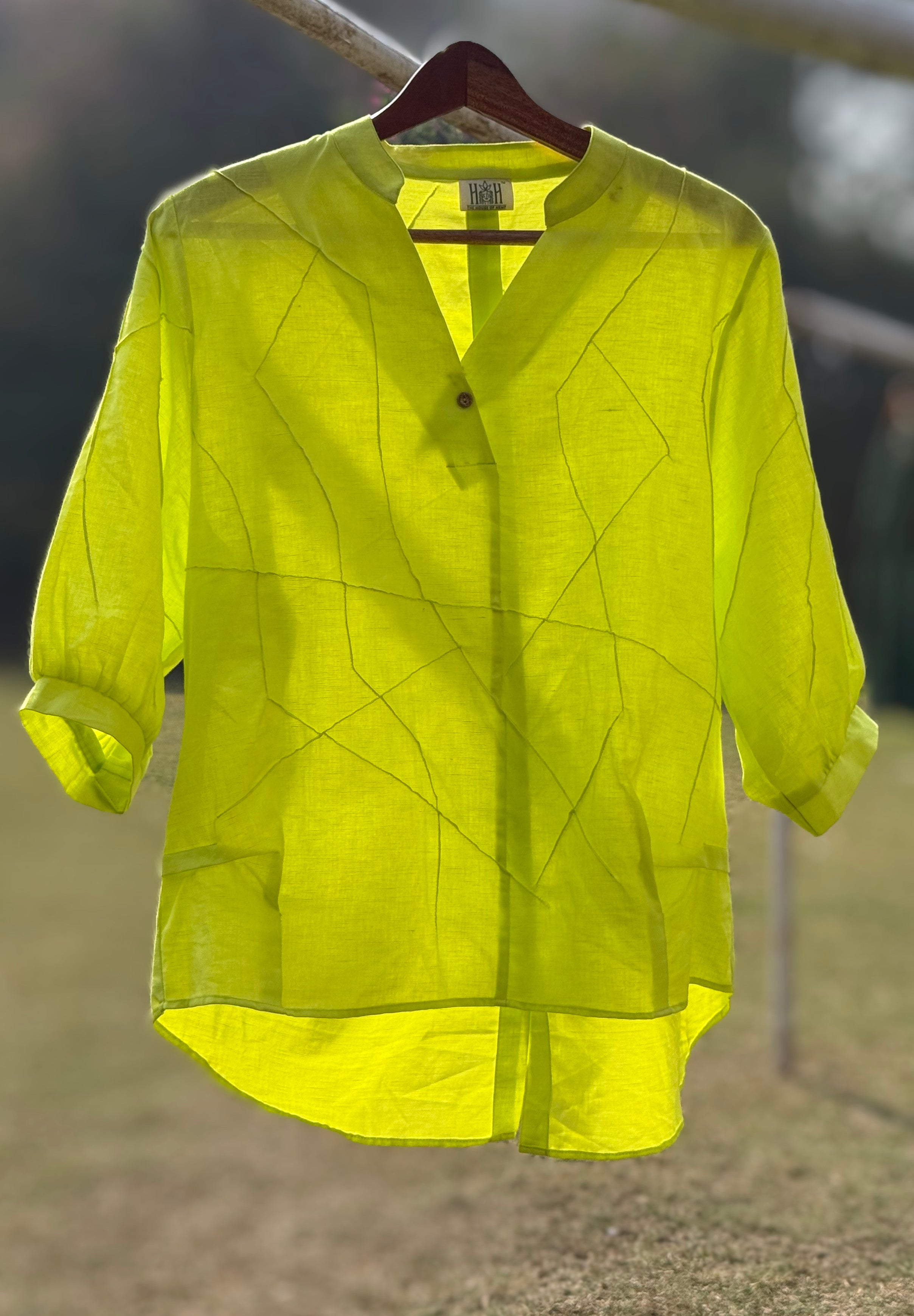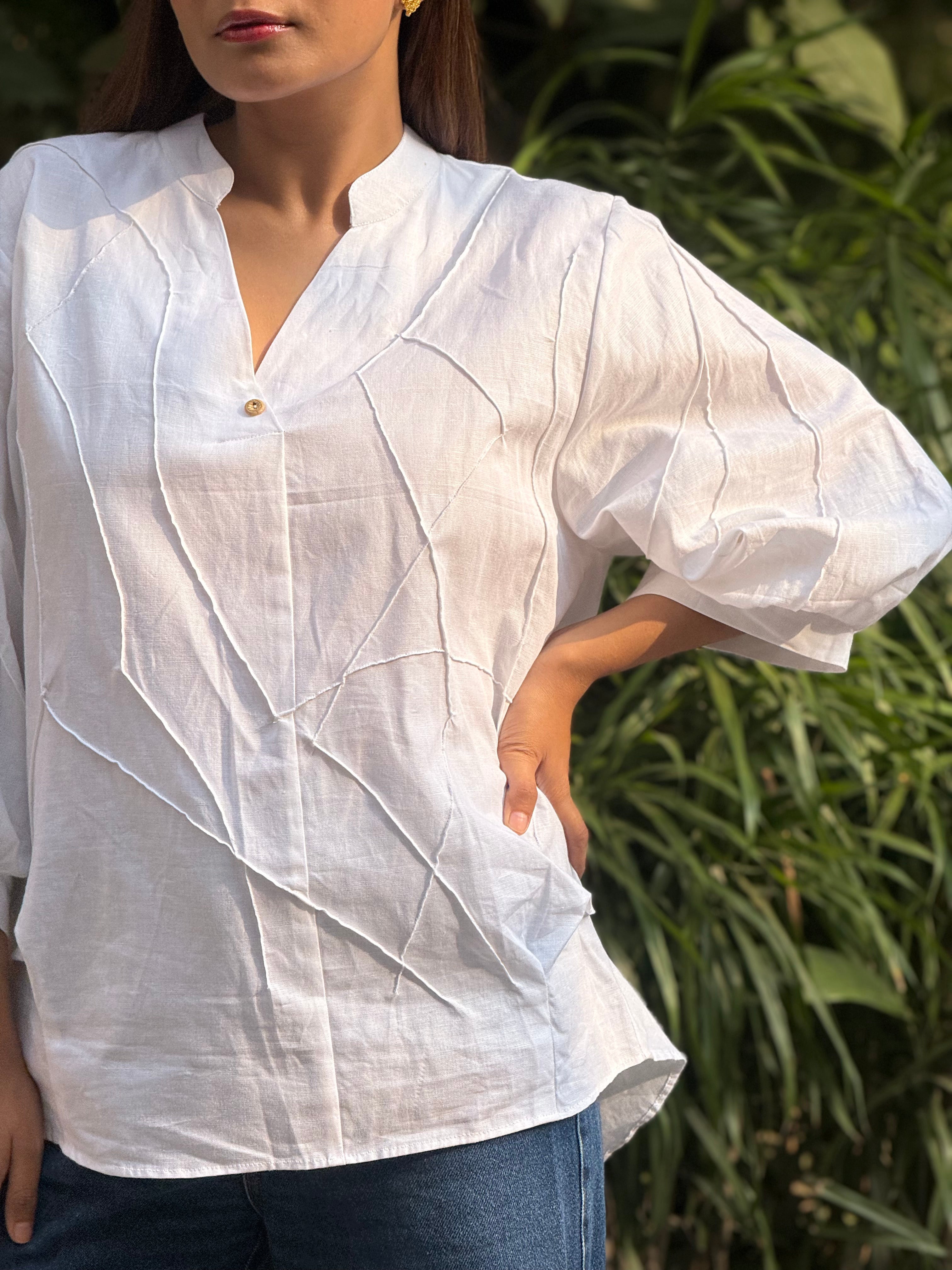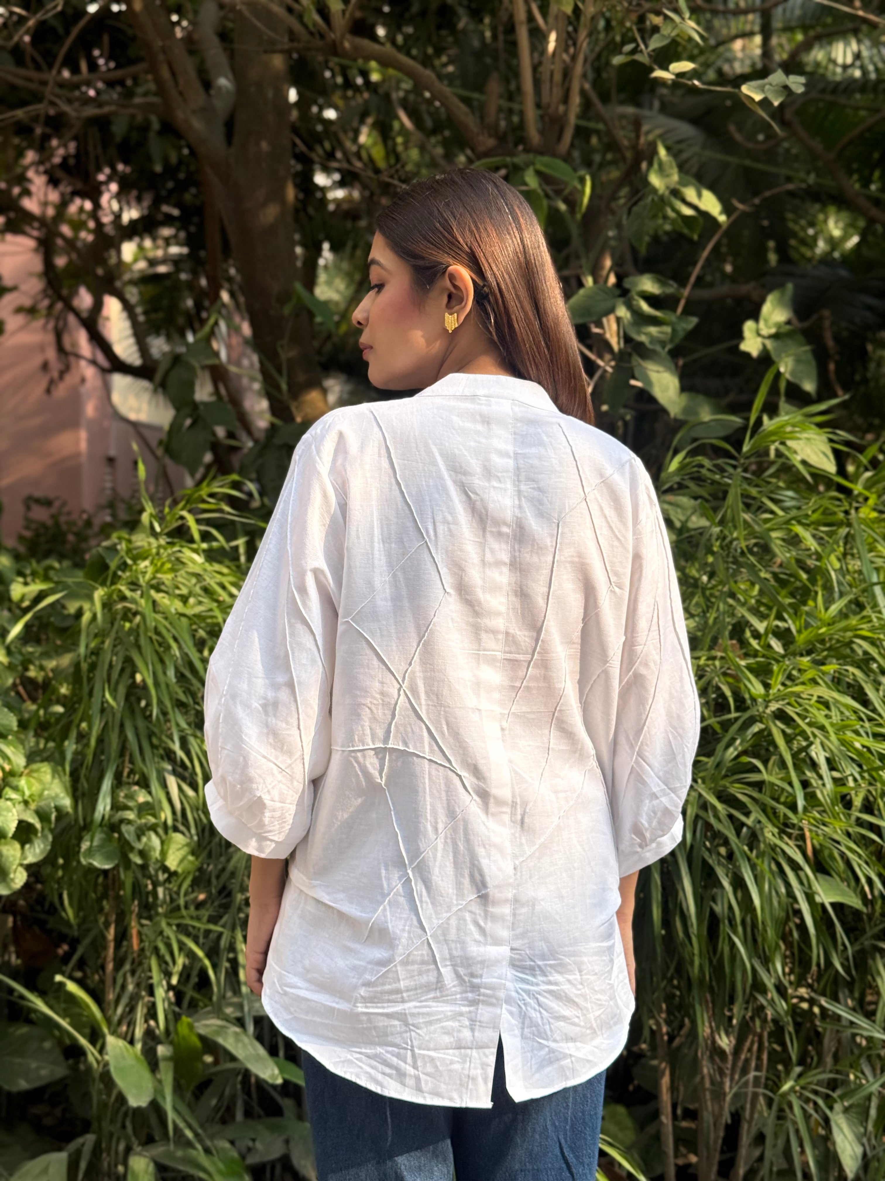 Designed for everyday ease with a design-forward touch, the Criss-Cross Calm Shirt features an anti-fit silhouette with soft geometric seam detailing that adds subtle structure and visual interest. Crafted in a breathable Hemp & Organic Cotton blend, it comes with a clean mandarin-notch neckline, relaxed 3/4th sleeves, and a slightly curved hem that flatters across body types. Easy to style with denims, trousers, or co-ord bottoms, this shirt transitions seamlessly from workdays to slow weekends, offering comfort, versatility, and conscious elegance in every wear.