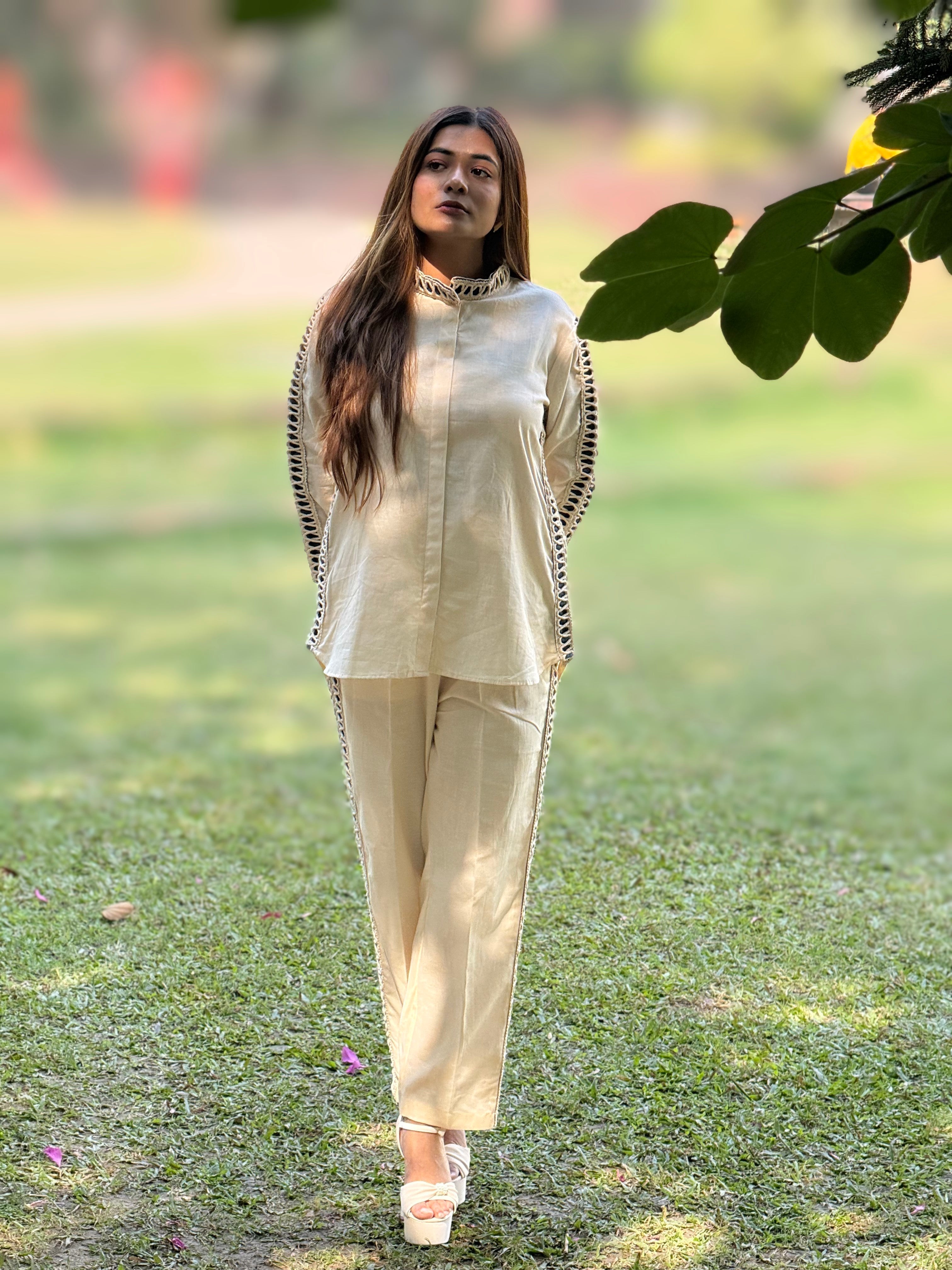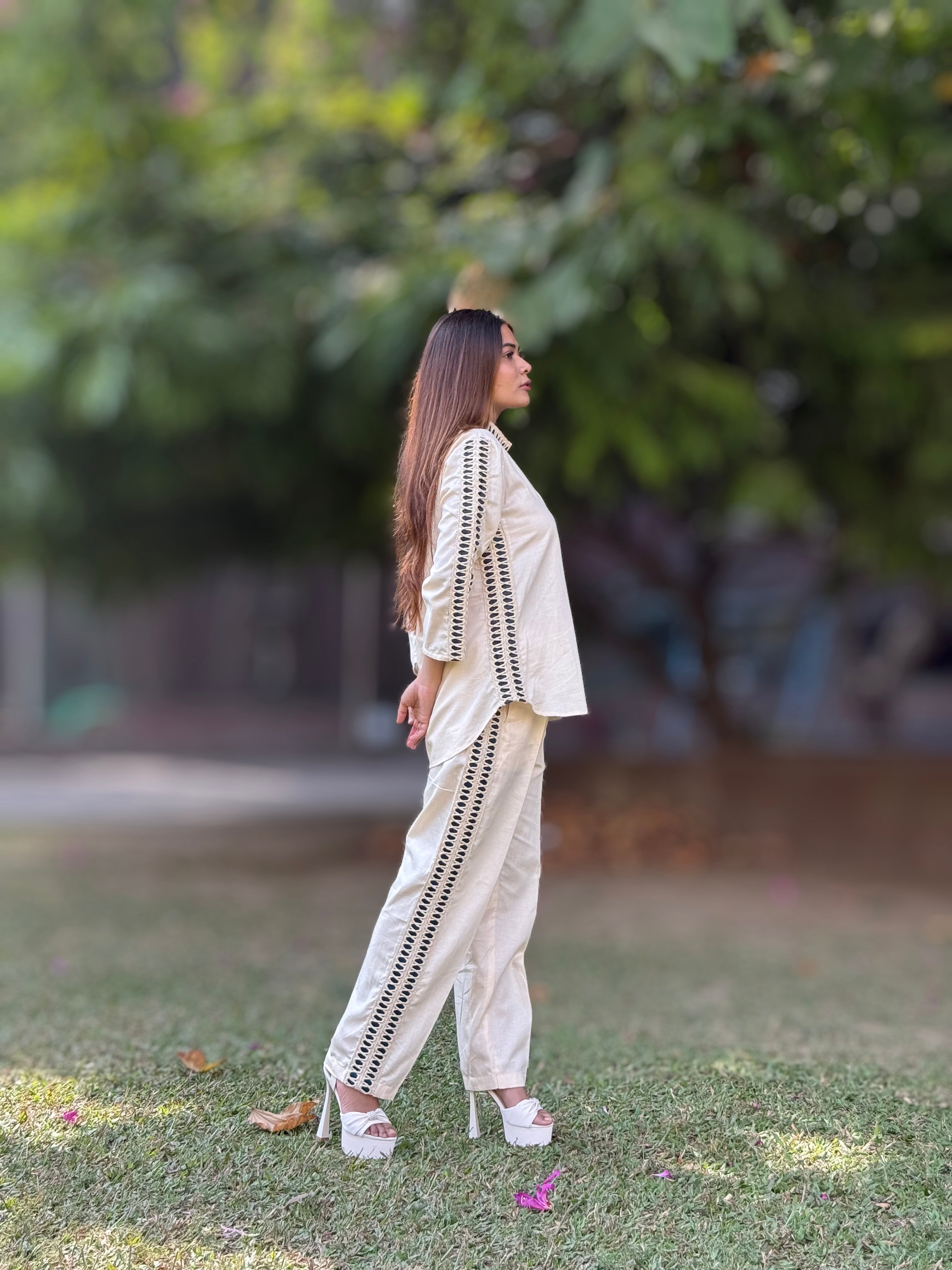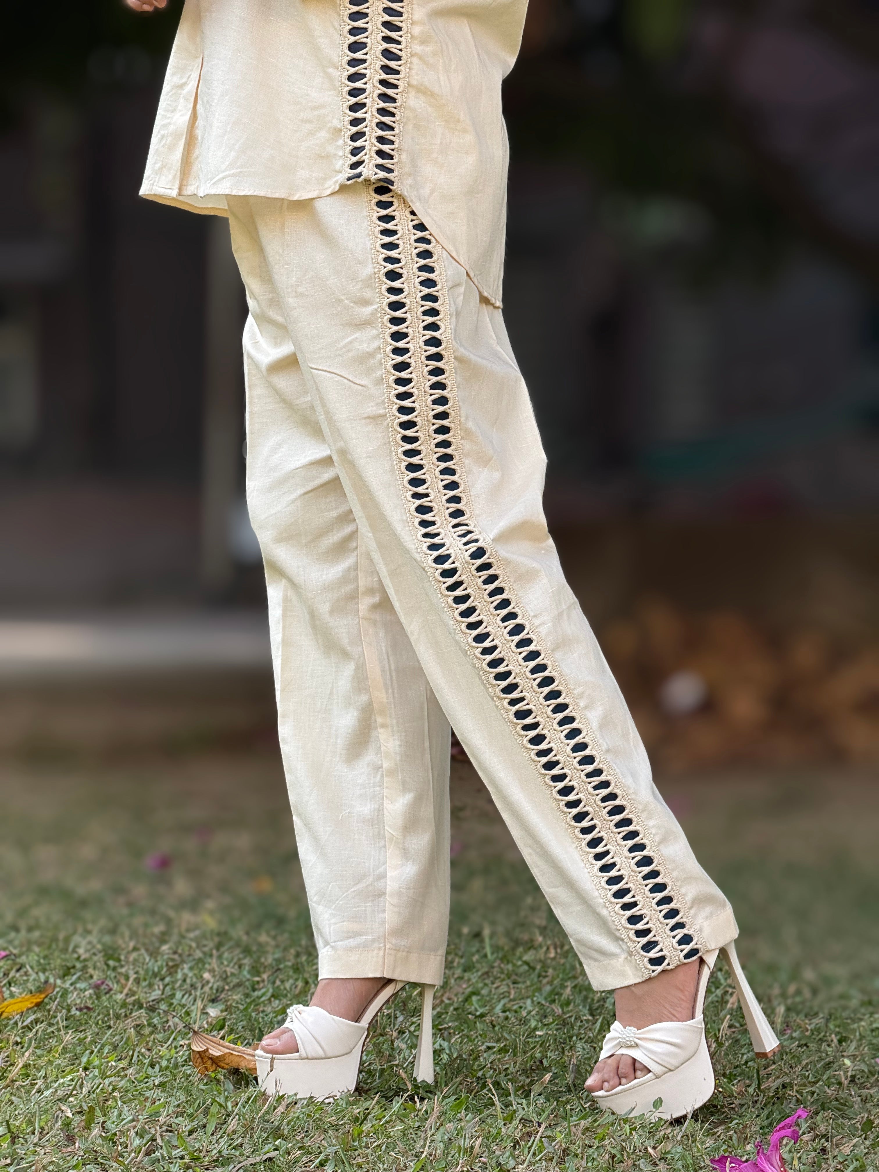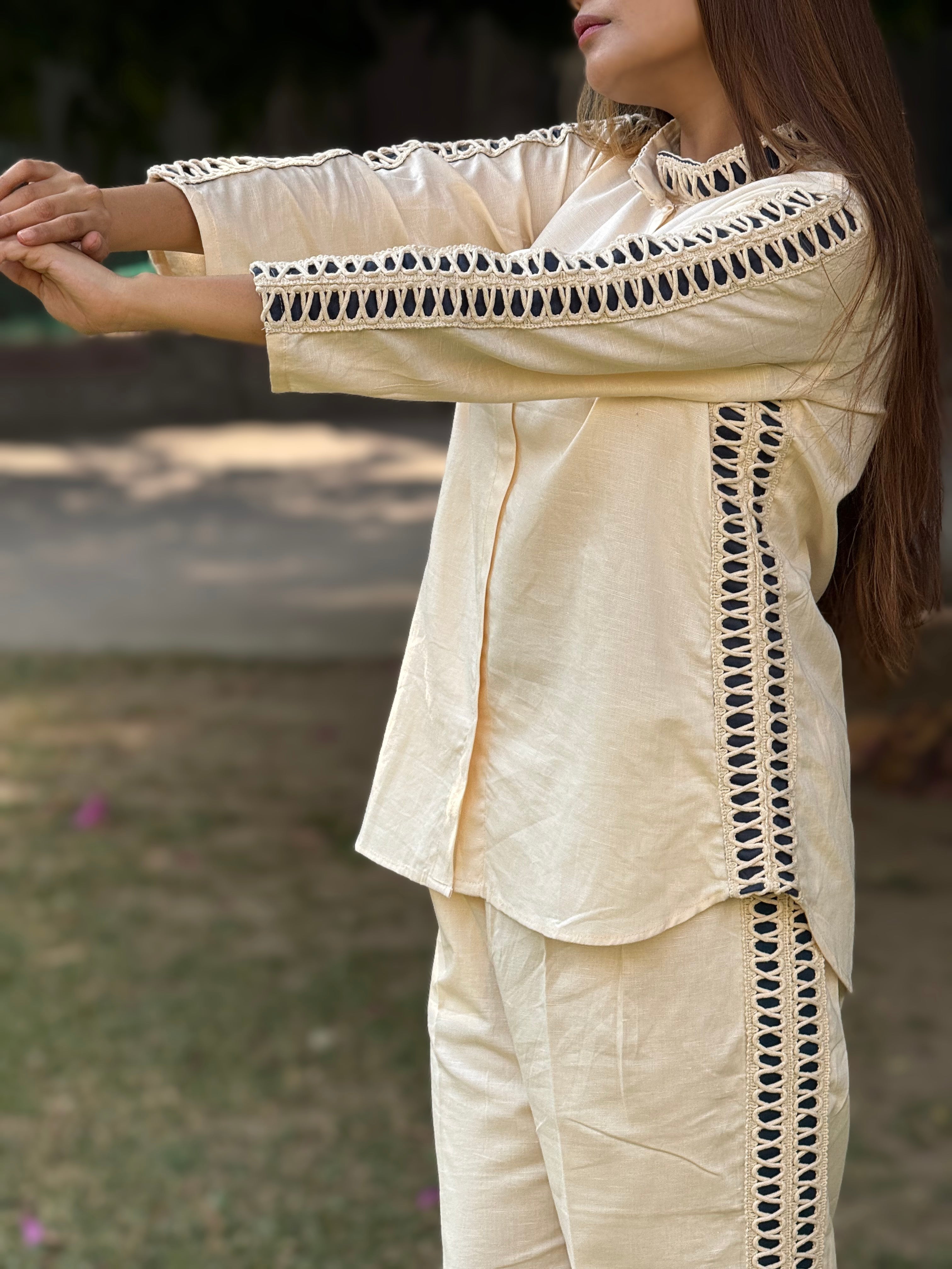 Ivory Lattice Co-ord Set features a straight-cut shirt paired with tailored pants, both highlighted with intricate ladder-style lace detailing running along the sleeves, side panels, and pant seams for a refined handcrafted finish. The clean front placket and structured collar add a smart, contemporary touch, making it perfect for elevated day wear and formal occasions alike. Crafted from our signature Hemp & Organic Cotton blend, the fabric is naturally antibacterial and odour resistant, UV resistant, and thermo-regulating, offering comfort across all seasons. It softens with every wash and is mill-dyed for lasting colour fastness, ensuring timeless elegance with conscious comfort.