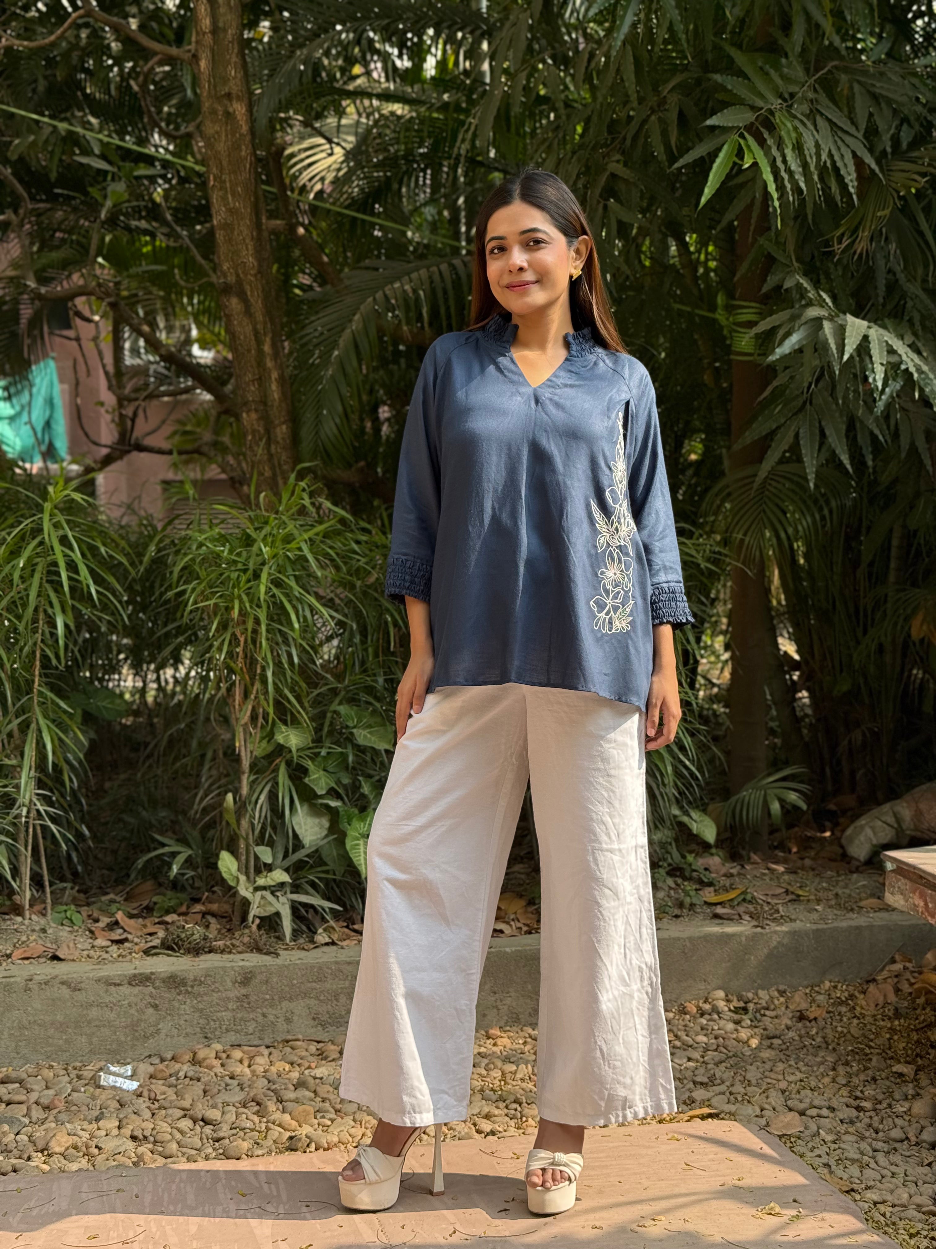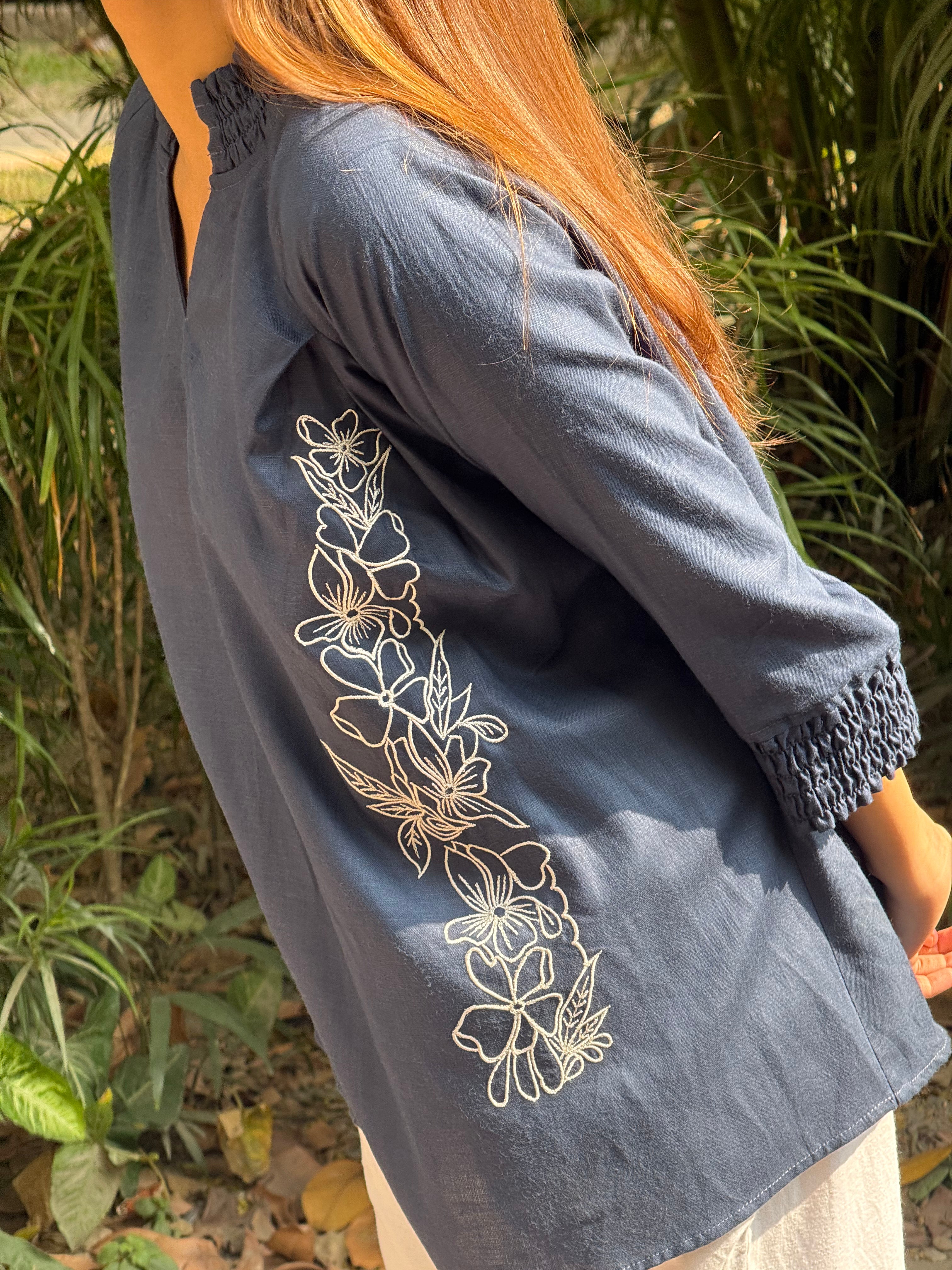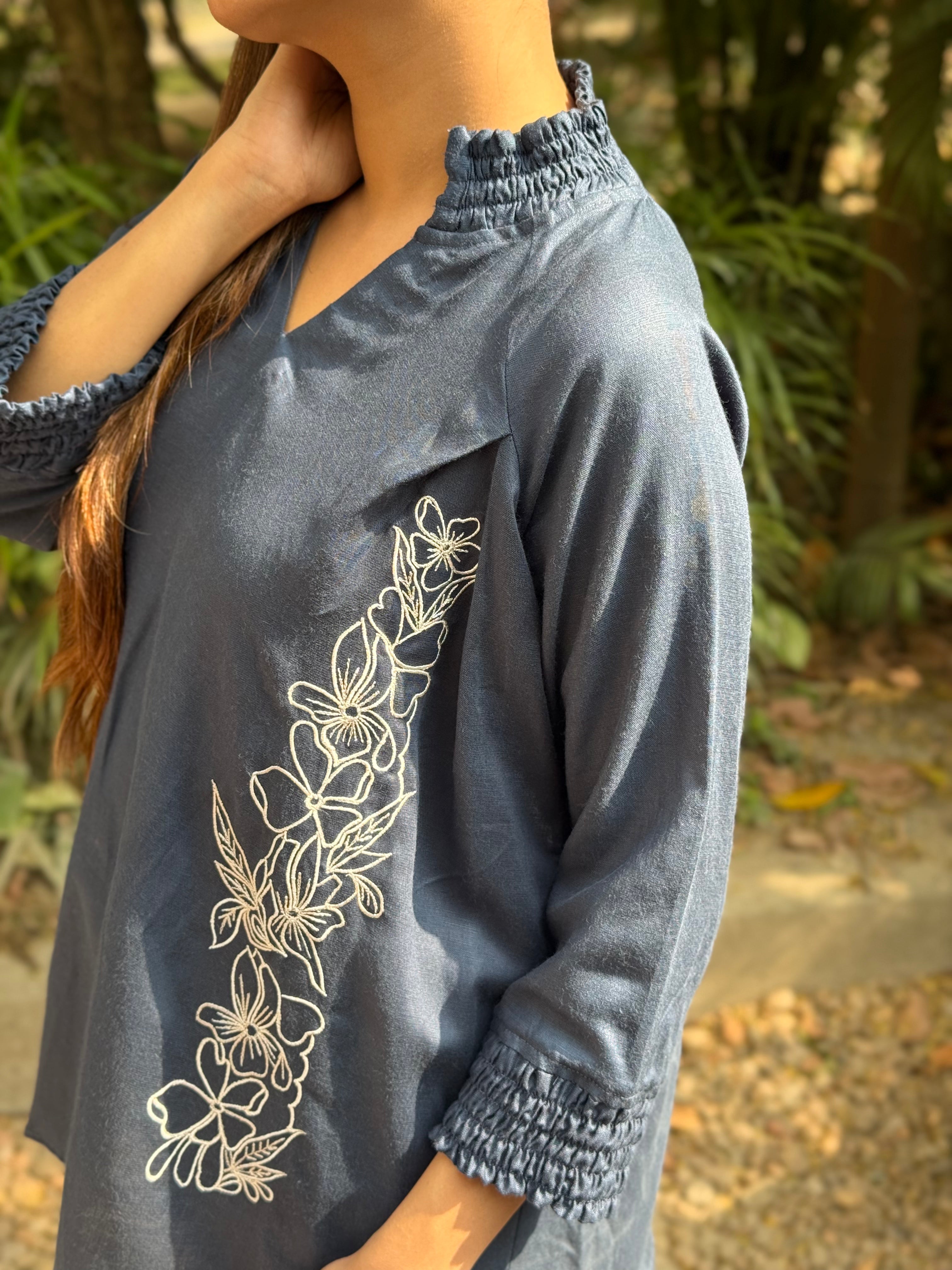 Twilight Vine Top is a relaxed anti-fit silhouette featuring a soft V-slit neckline, gently smocked sleeve cuffs, and graceful floral hand embroidery cascading along the side panel. The design adds a subtle statement while keeping the overall look clean and versatile for everyday wear. Crafted from a premium blend of Hemp & Organic Cotton, the fabric is naturally antibacterial and odour resistant, UV resistant, and thermo-regulating, making it comfortable across all seasons. It softens with every wash and is mill-dyed for excellent colour fastness, ensuring long-lasting depth of shade without bleeding. Effortless, breathable, and consciously made for modern, mindful dressing.