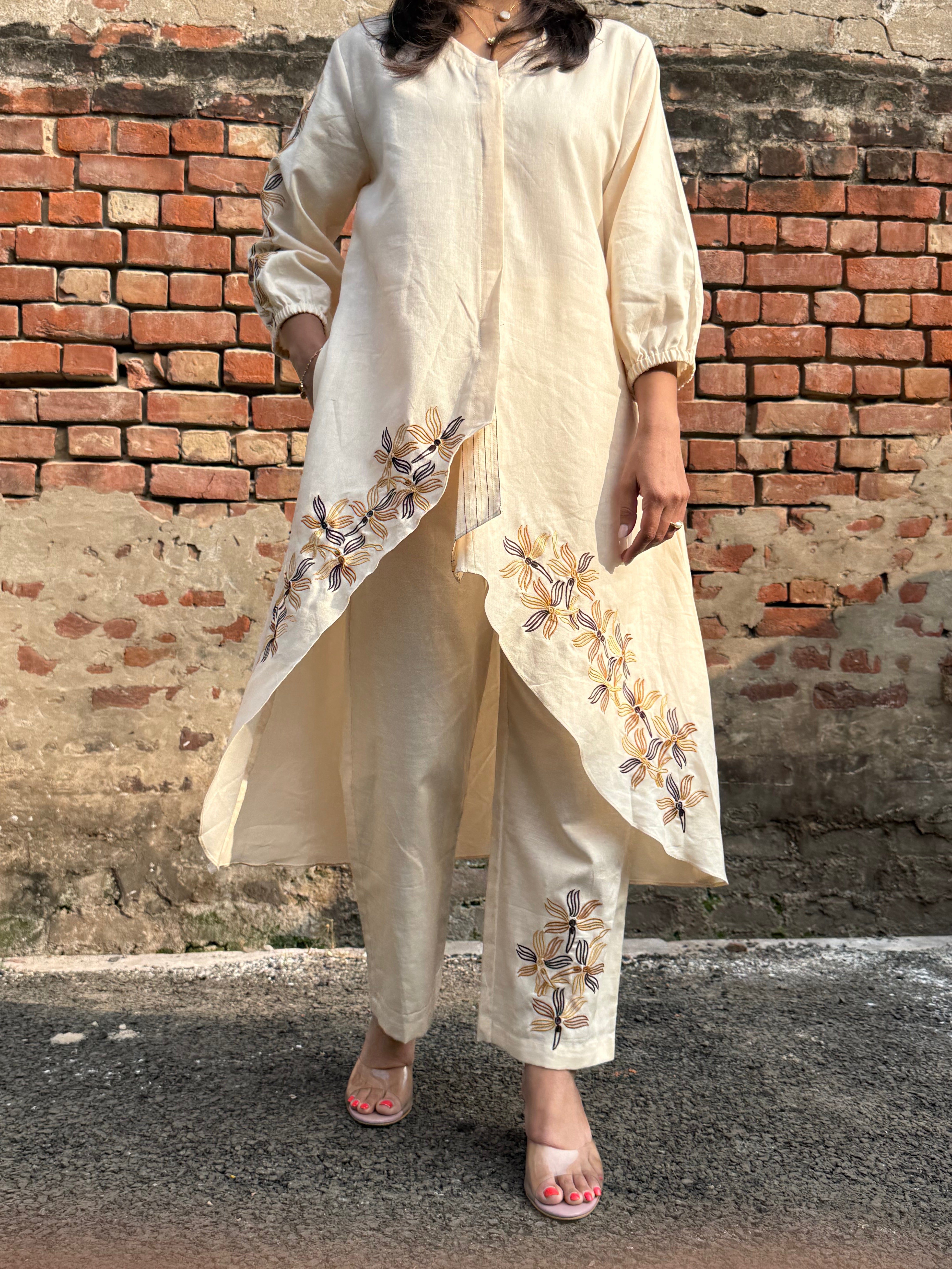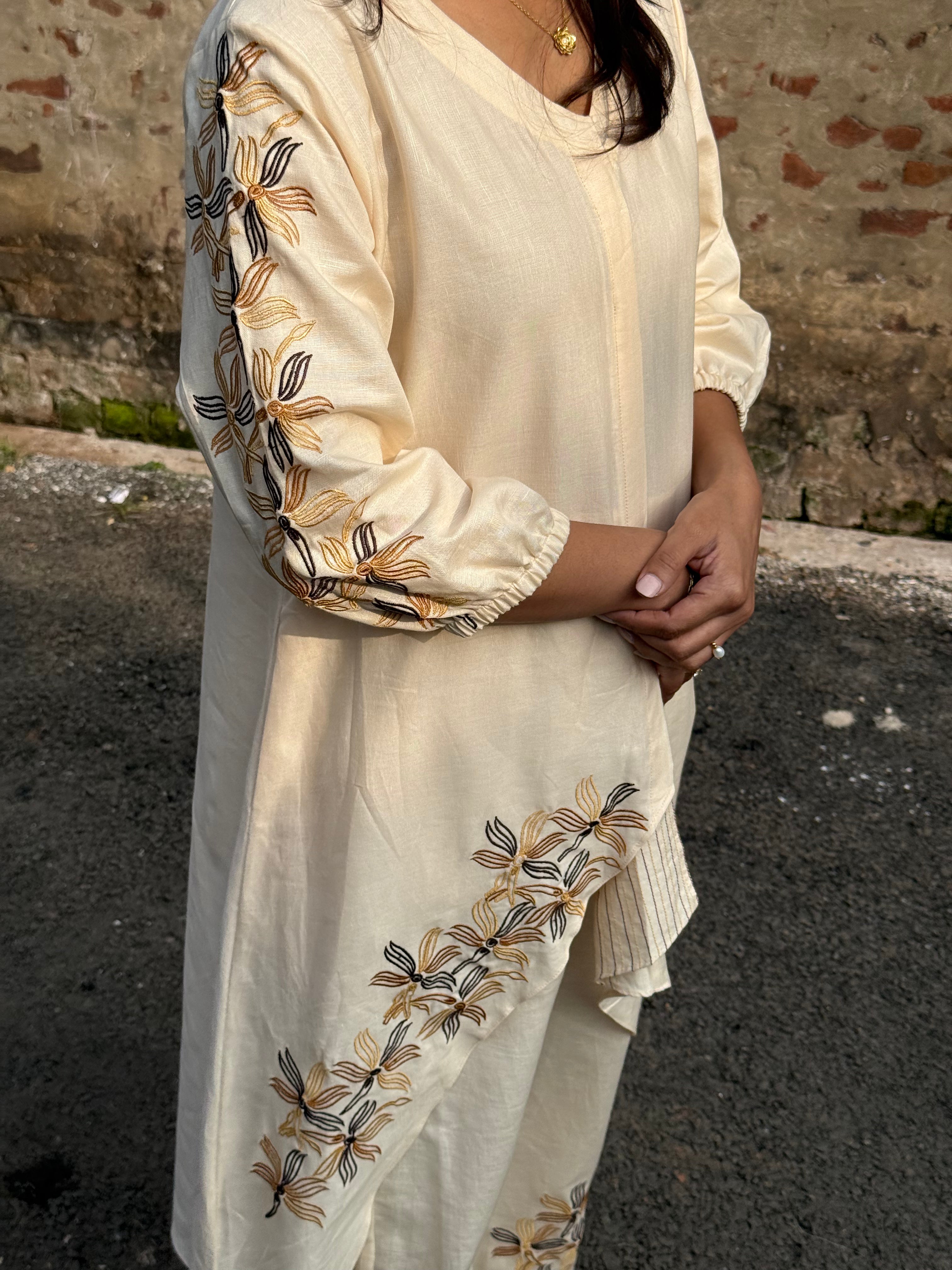 Designed with a flattering V-neckline, wide-leg ease, and functional side pockets, it blends the comfort of a jumpsuit with the elegance of artisanal detailing. The embroidery along the sleeves, drape, and pants adds vibrant subtlety to the deep black canvas, making it versatile from day sophistication to evening allure.
