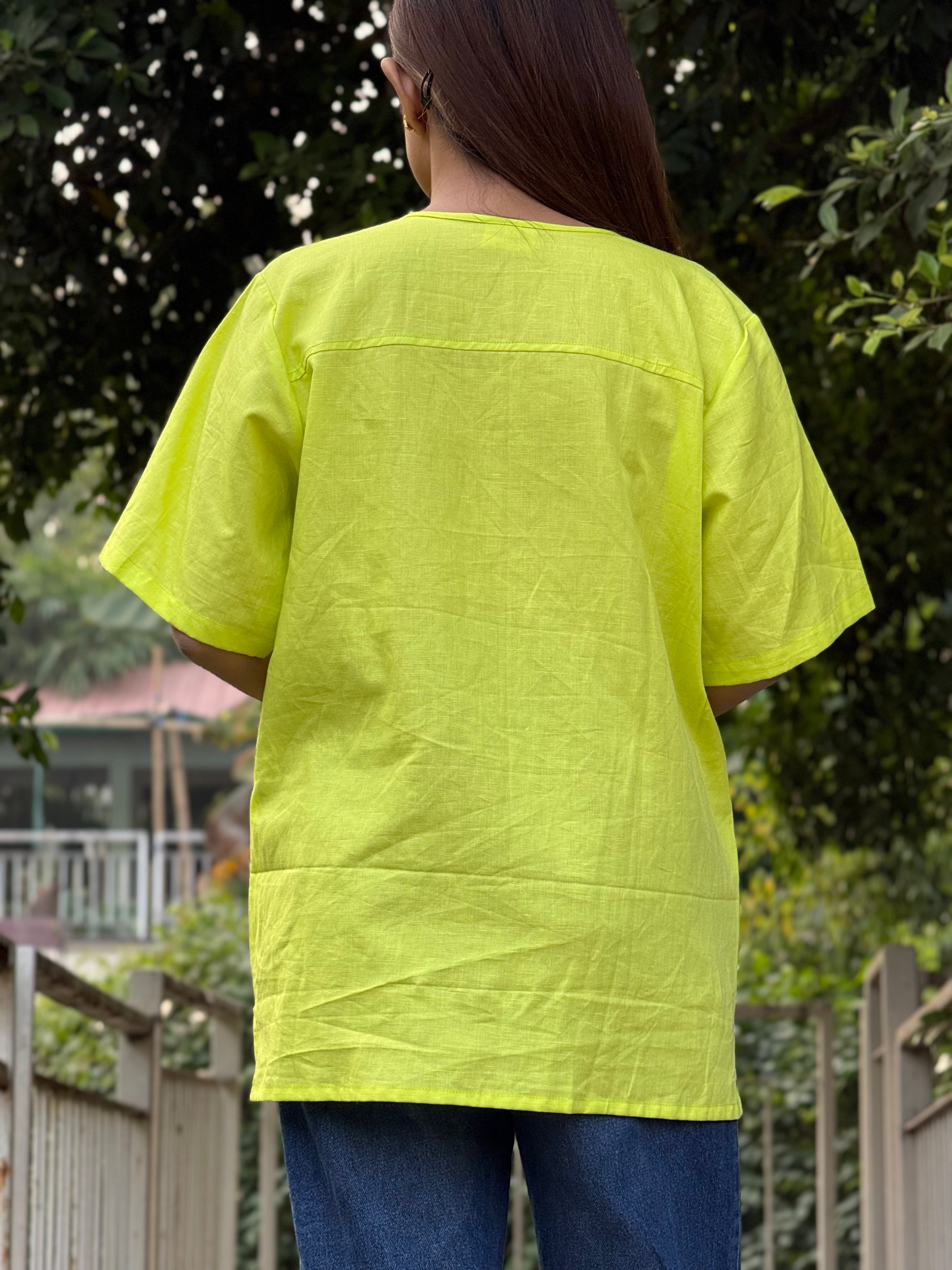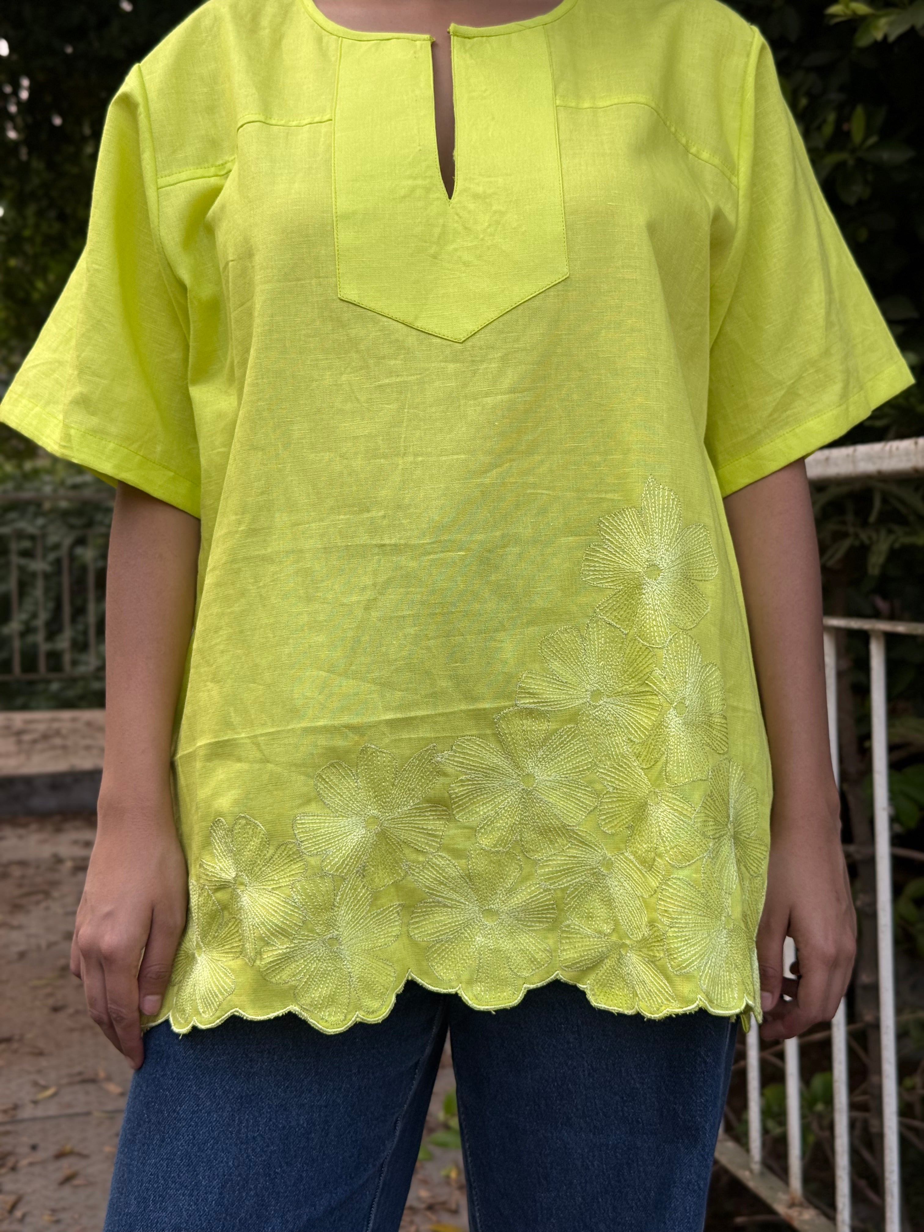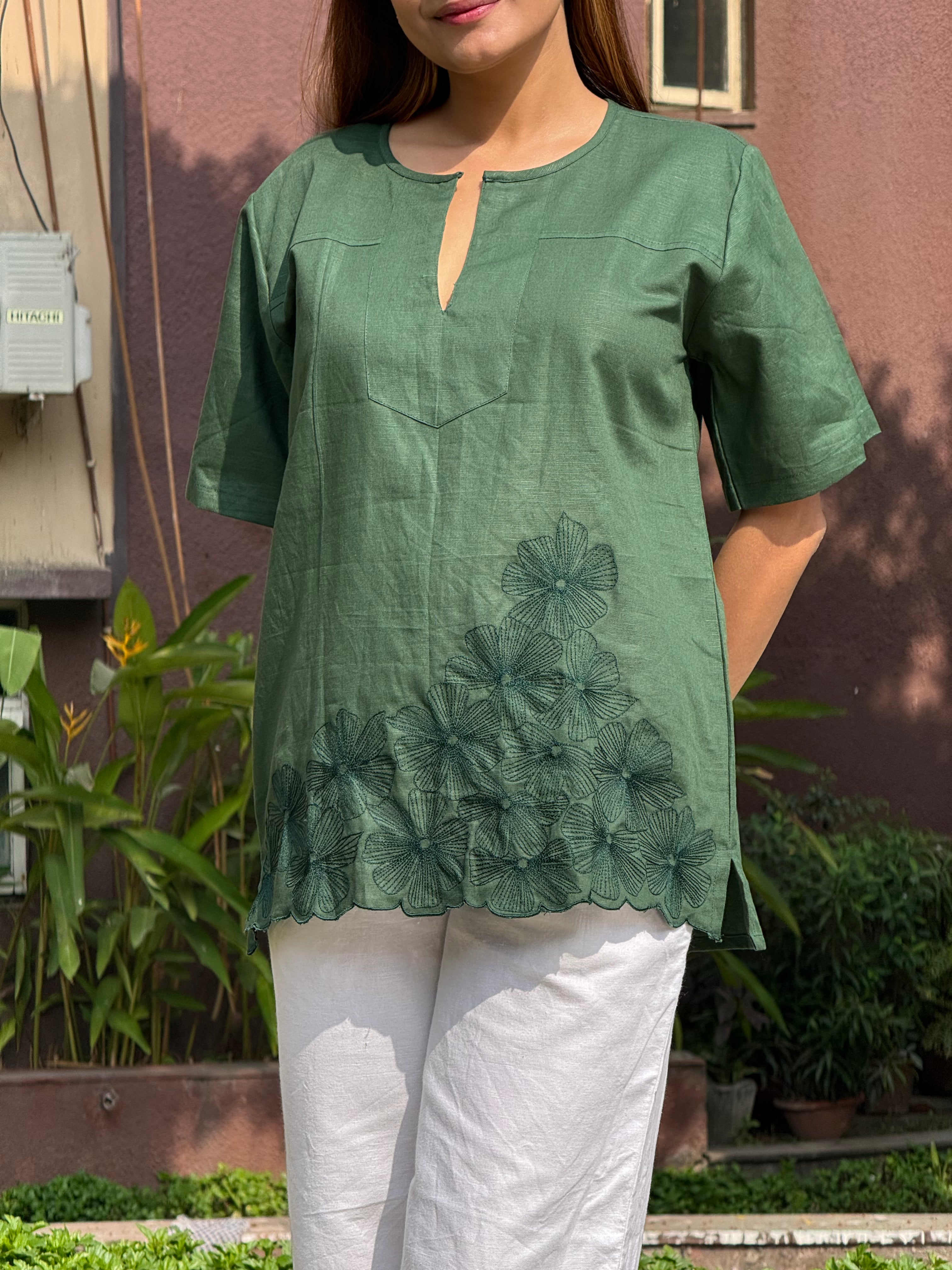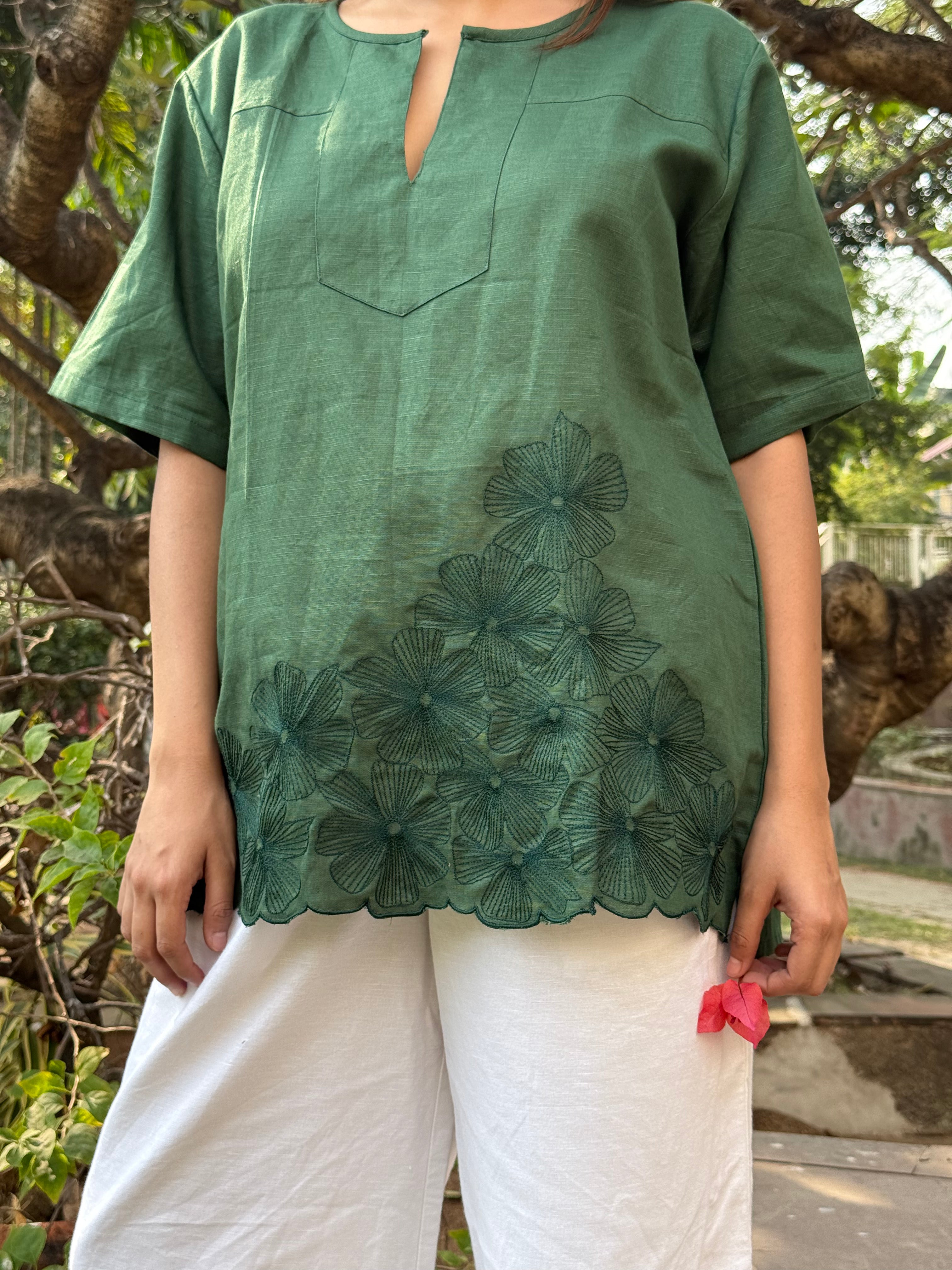 Meadow Drift Top is a relaxed anti-fit top crafted from a conscious blend of Hemp & Organic Cotton, designed for breathable comfort and effortless elegance. Featuring a soft slit neckline, easy short sleeves, and delicate floral hand embroidery blooming along the hem, this piece brings a gentle statement to everyday dressing. Naturally antibacterial and odour resistant, the fabric keeps you feeling fresh, while its UV-resistant and thermo-regulating properties make it perfect for all seasons. Mill-dyed for lasting colour fastness, it softens with every wash and stays kind to your skin and the planet. Easy, airy, and endlessly versatile.