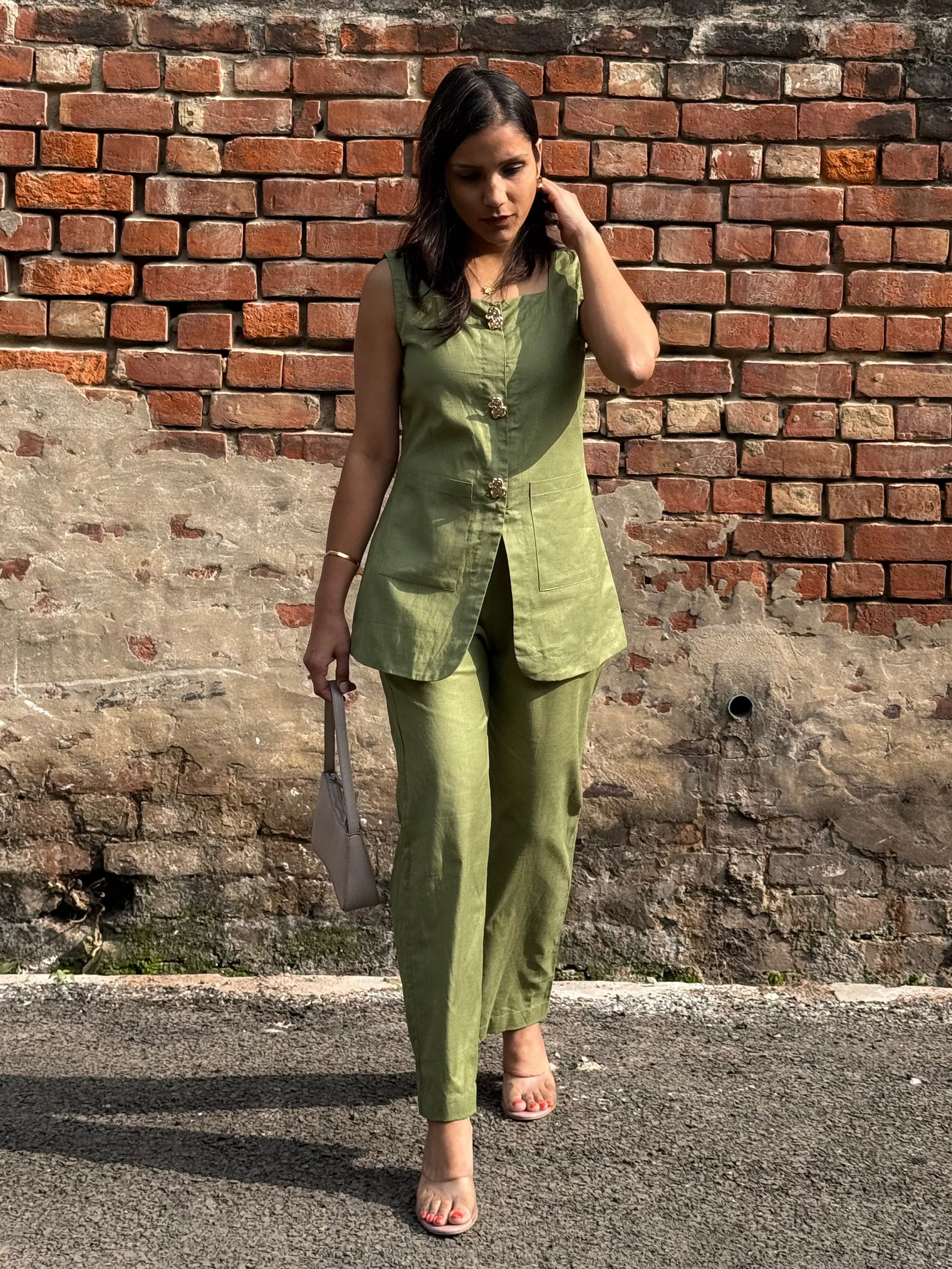 Olive Ledger is a straight-cut co-ord set crafted from a refined blend of Hemp & Tencel, designed for modern, conscious office wear. Featuring a structured square-neck top and tailored pants with functional pockets, the silhouette balances ease with formality. Subtle golden metal buttons add a quiet accent, elevating the minimal design without excess. Naturally breathable and soft on the skin, the fabric ensures comfort through long workdays. Available in Olive, Navy Blue, Black, Ivory, Grey, and White, Olive Ledger is a versatile, timeless essential for polished everyday dressing.