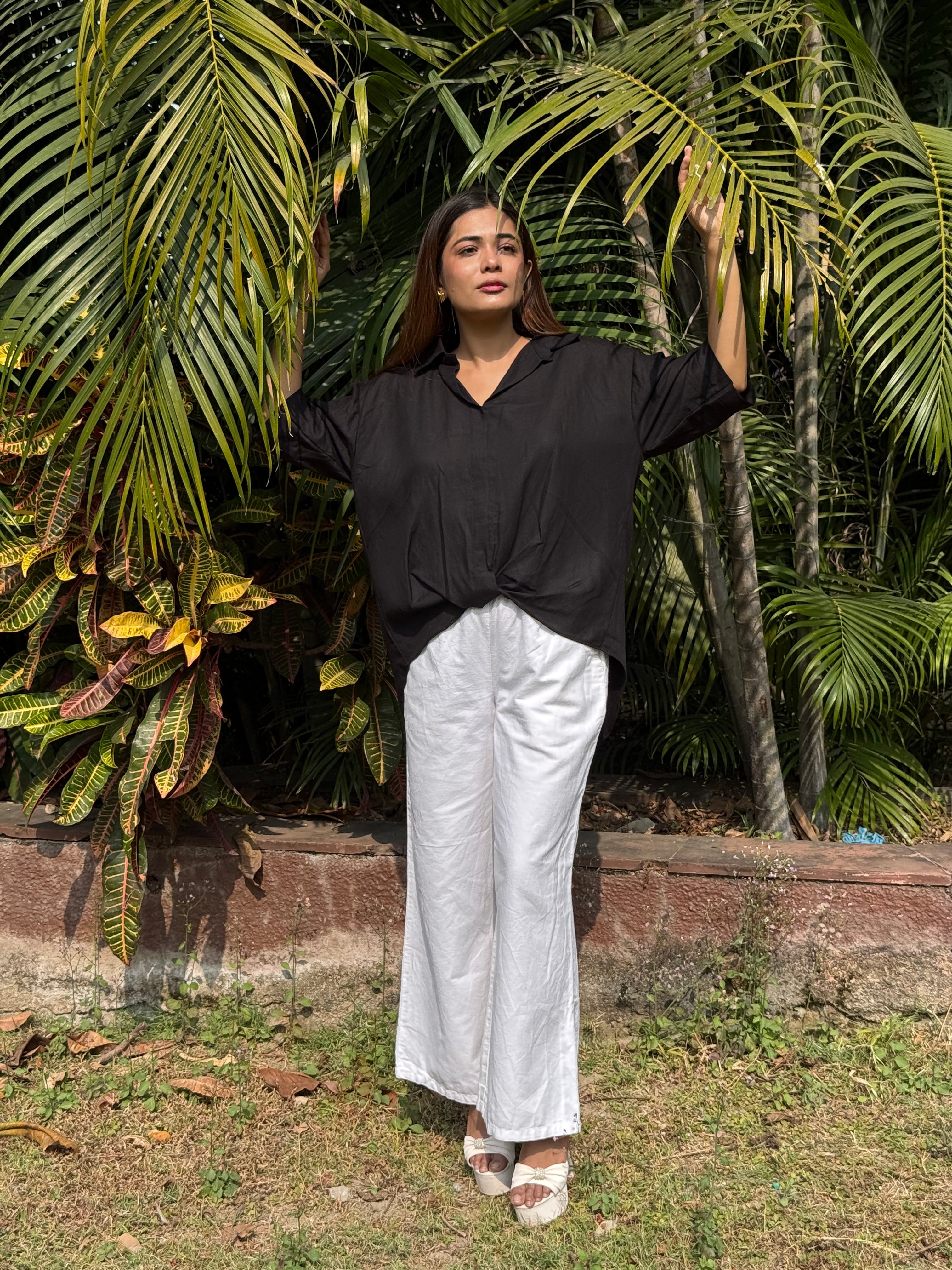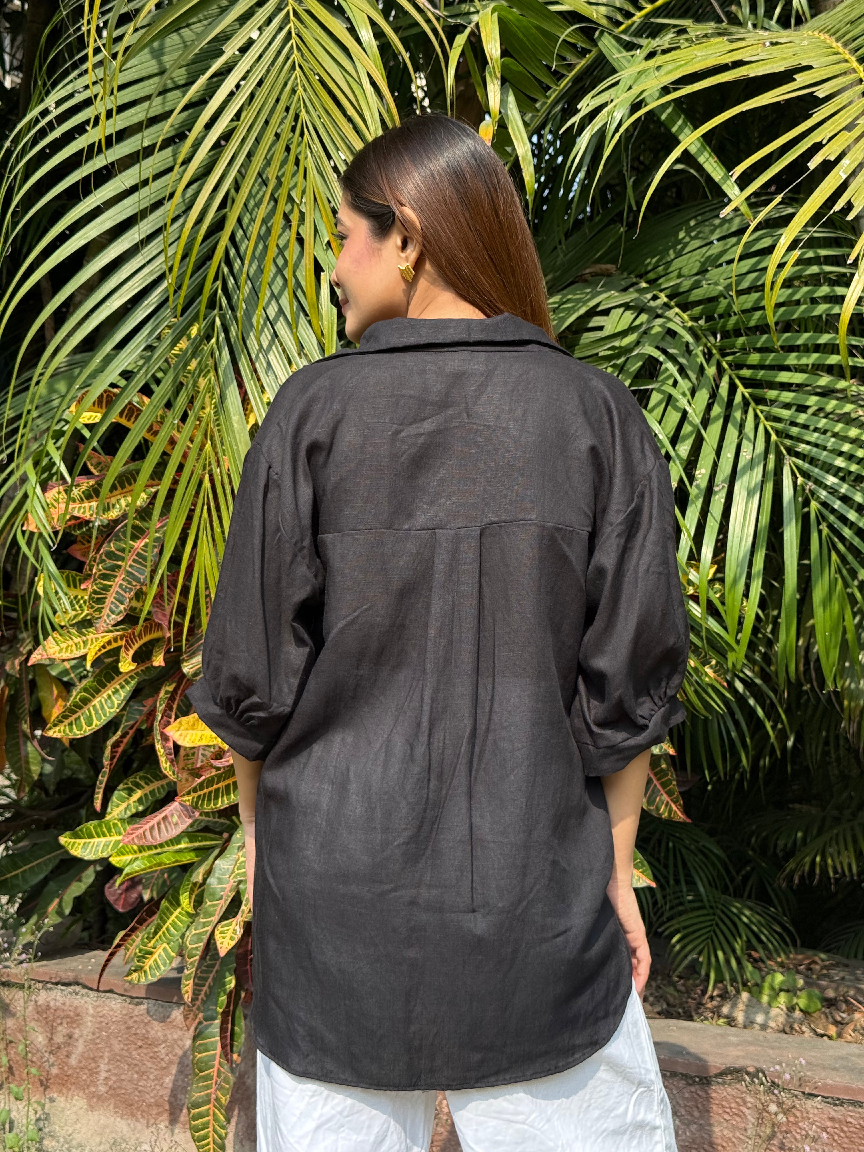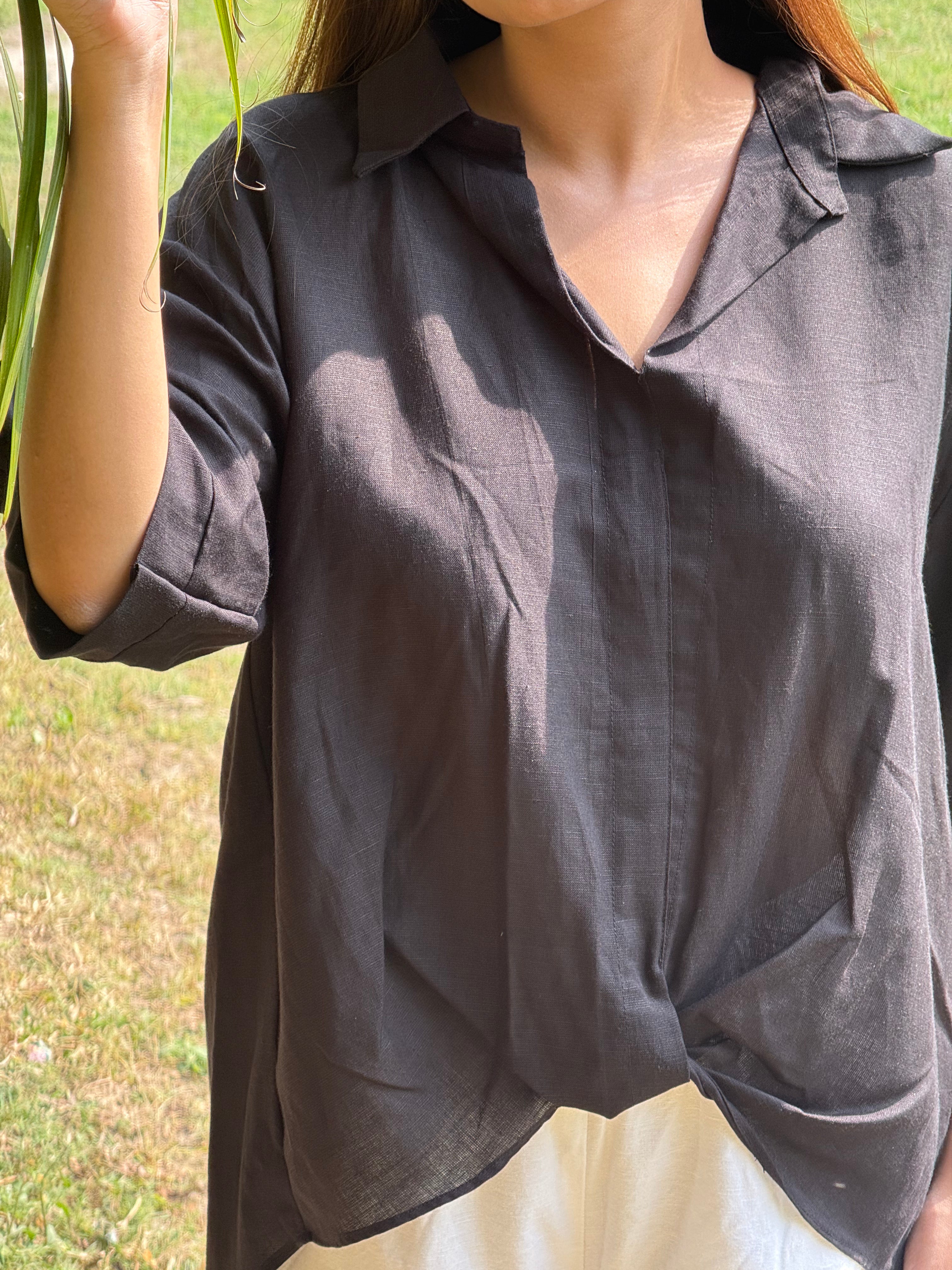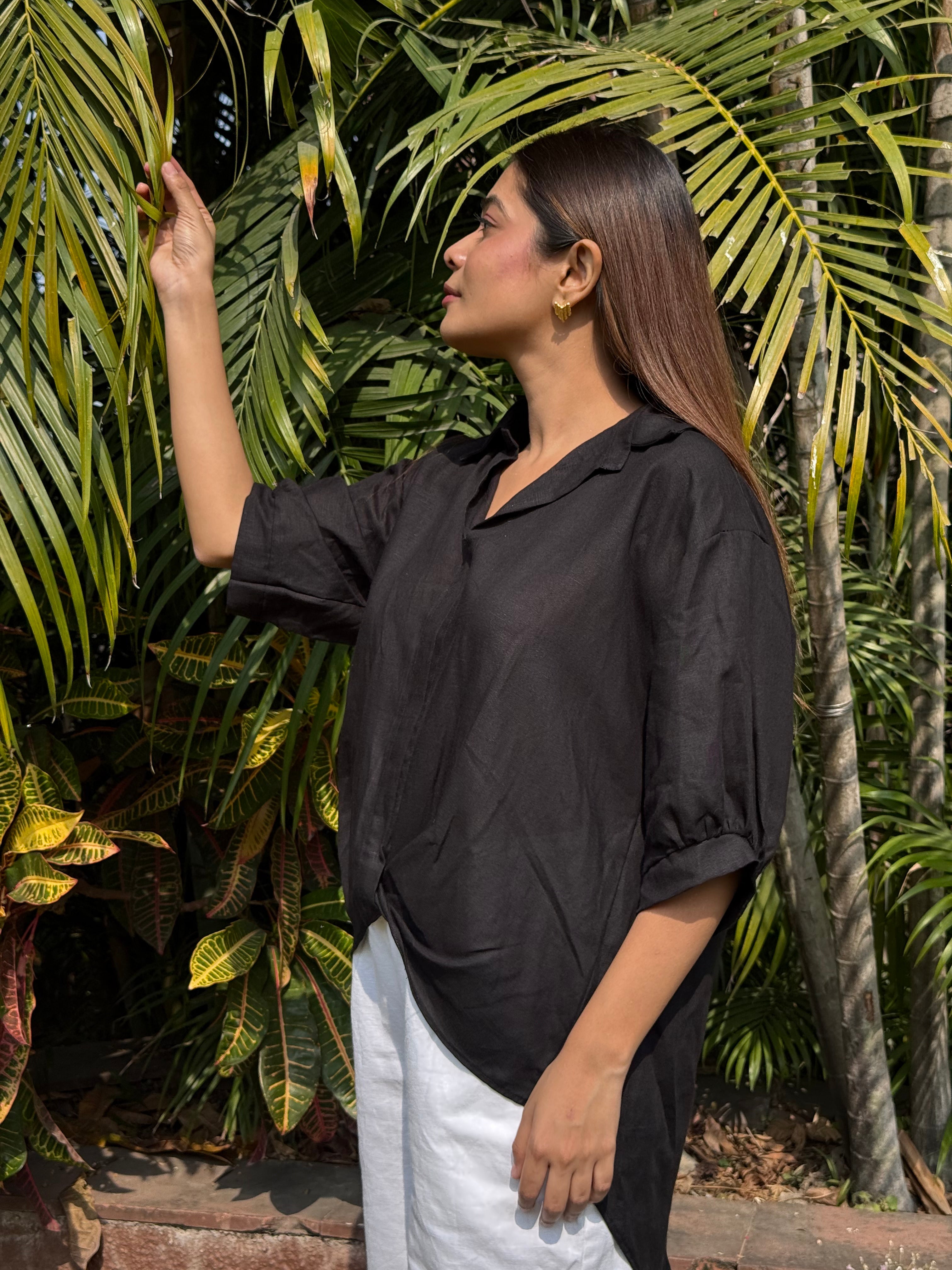 Midnight Fold Shirt is an anti-fit, relaxed silhouette designed with a soft shirt collar and a distinctive front fold overlap that adds effortless structure and fluid movement. The easy three-quarter sleeves and slightly longer back hem create a flattering, laid-back drape that works beautifully for both casual and elevated styling. Crafted from a conscious blend of Hemp & Organic Cotton, the fabric is naturally antibacterial and odour resistant, UV resistant, and thermo-regulating for comfort across all seasons. It softens with every wash and retains its deep black tone through mill-dyed colour fastness without bleeding. A timeless staple with quiet character, designed for everyday confidence.